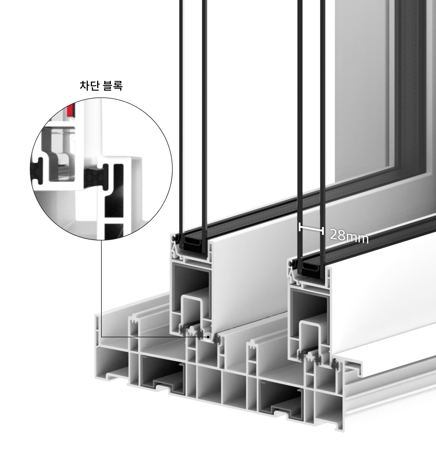 | 기능성 핸들 내부 ASA 컬러레일 레일커버 윈드실더 로이유리 일체형 차단블록 (이중창 기준) |